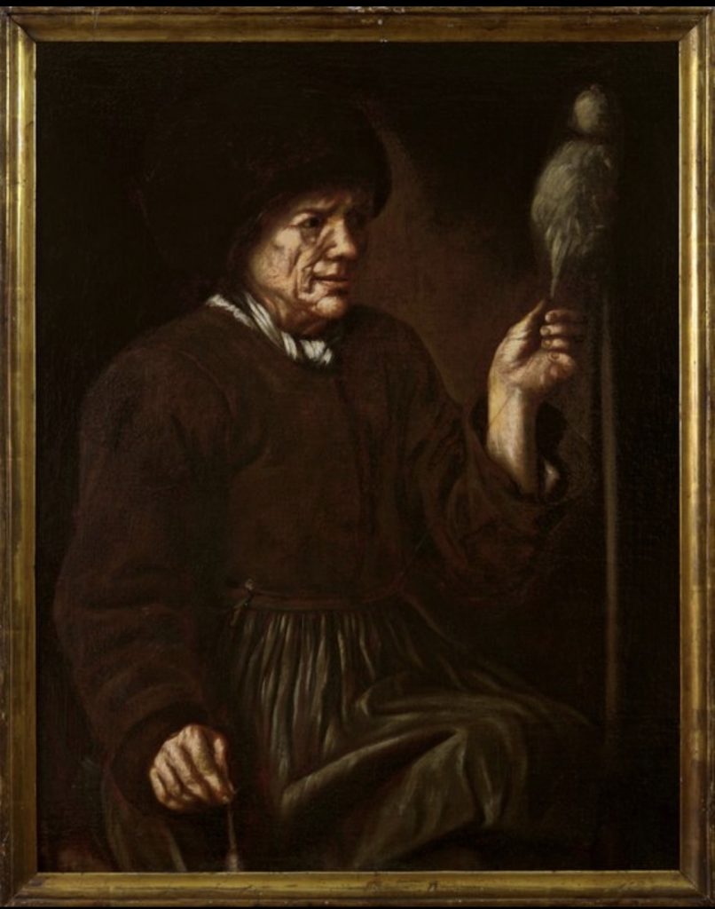 Il Dipinto raffigura un’anziana donna intenta a filare, colta a mezza figura con il canocchio e il fuso tra le mani. Dipinto ad olio su tela applicata su tavola misure 66×88 cm.